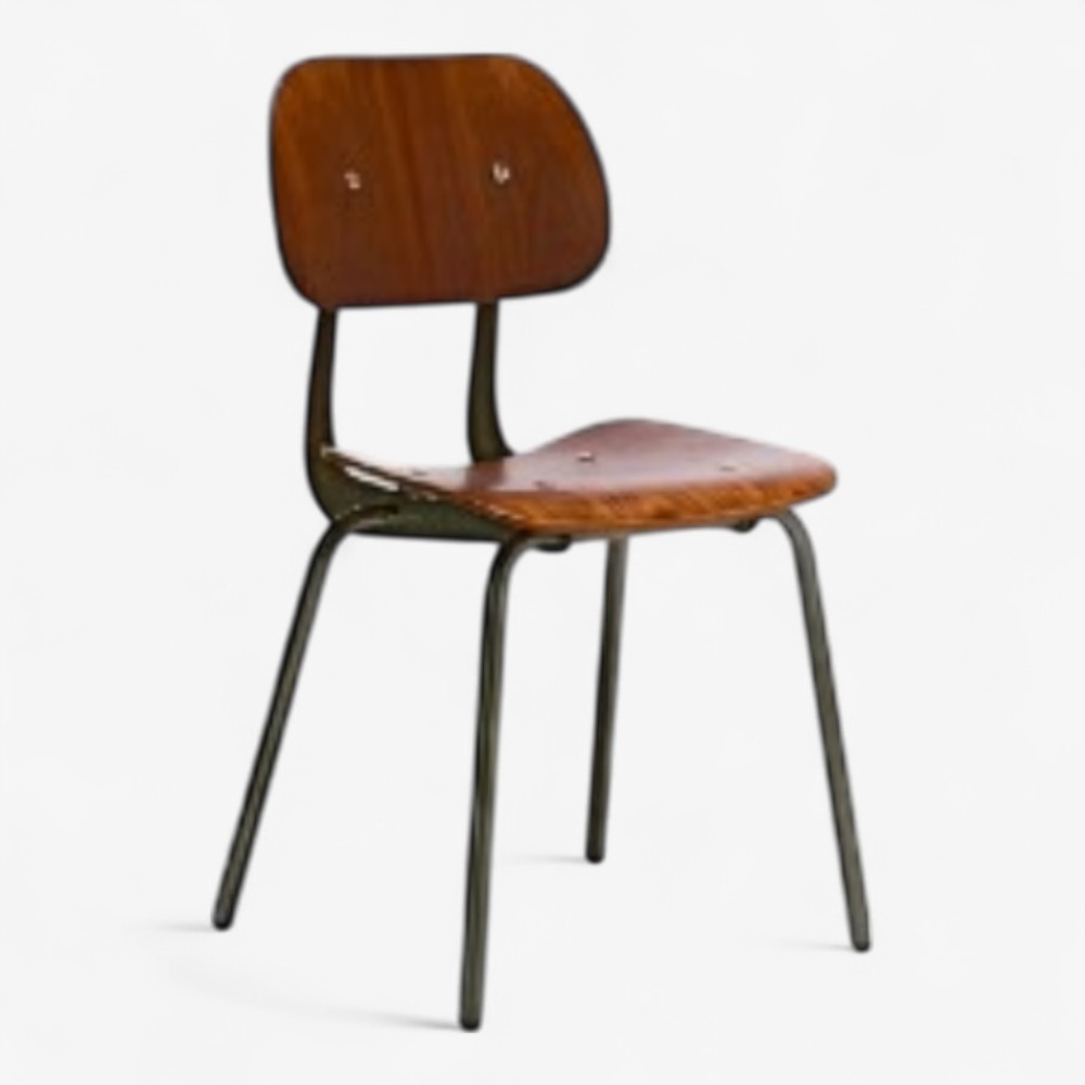 The Industry chair revives classic vintage charm with its curved wooden seat and backrest mounted on a slender metal frame. Suitable for cafes, bistros, and eclectic interiors.