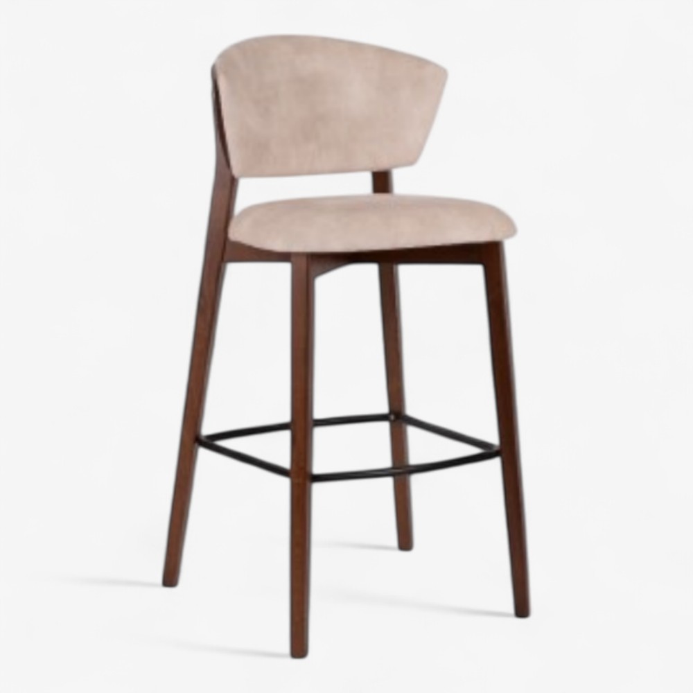The Billy B barstool combines a soft upholstered seat with a strong wooden frame. Its clean silhouette fits perfectly in modern hospitality interiors.