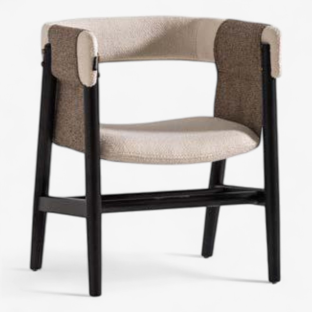 The Babil chair is a true statement of refined contemporary design. Featuring a distinctive curved backrest and armrests, it blends light textured fabric with dark wood tones to create a sophisticated aesthetic. The light brown leather backrest and beige cushioned seat offer superior comfort, while brass bolt accents bring a subtle industrial flair. Its sturdy black wooden legs ensure durability and stability, making it a stylish and practical choice for high-end dining spaces, hotel lobbies, or luxury lounges.