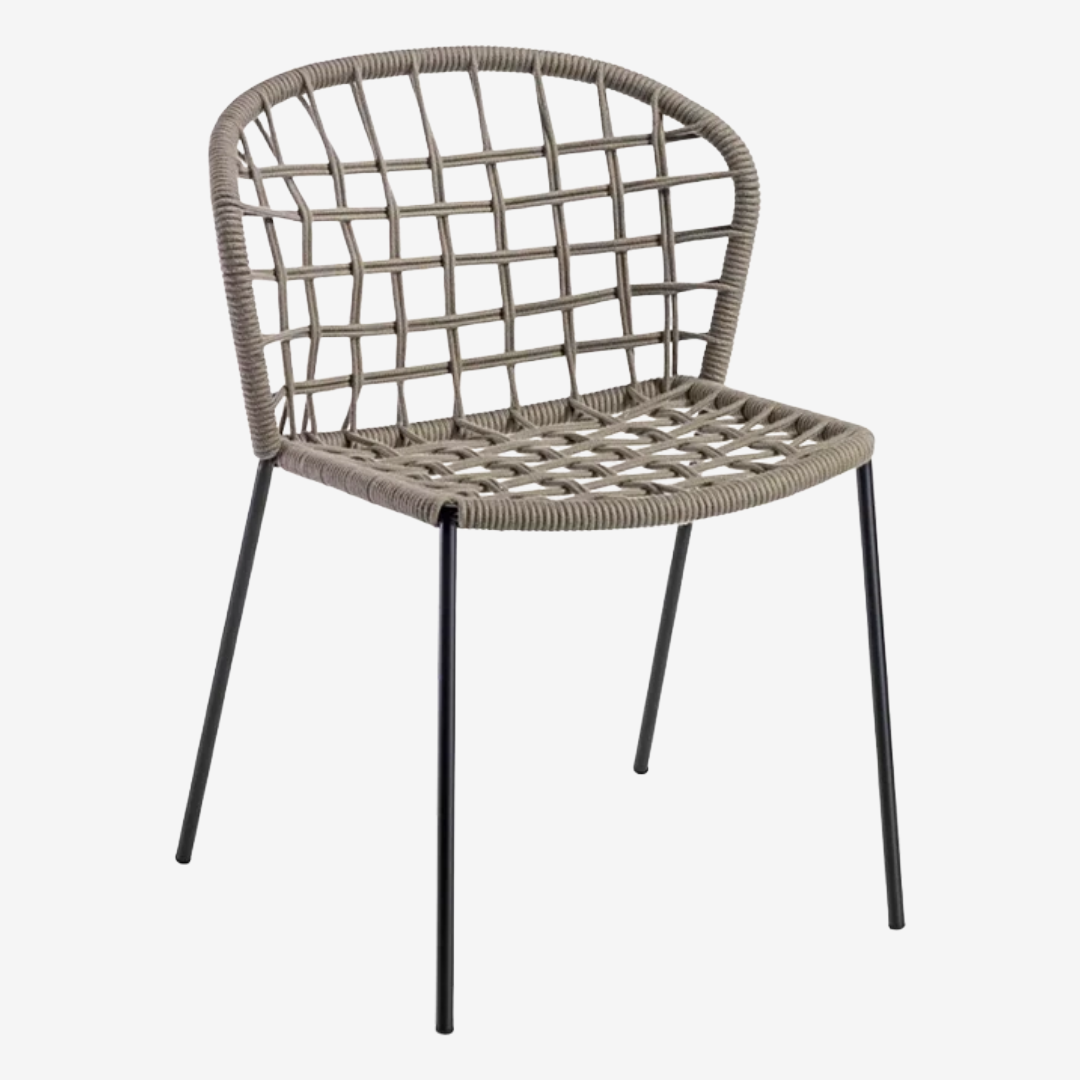 Sanela is defined by its artisanal weave of Teflon-treated Italian polyester rope. This stackable chair is lightfast and weather-resistant, offering a sophisticated look for upscale beach bars and hotel gardens where luxury meets durability.