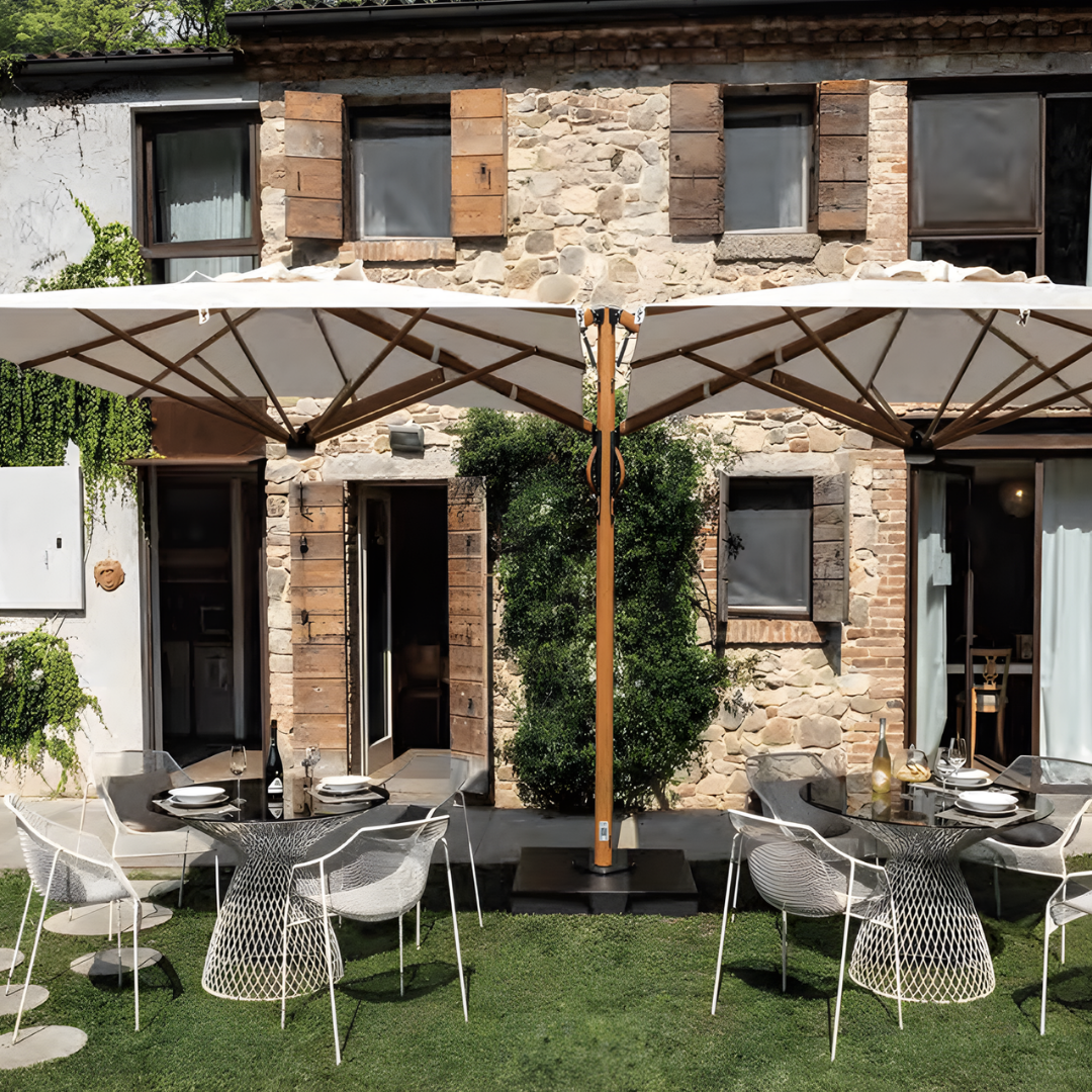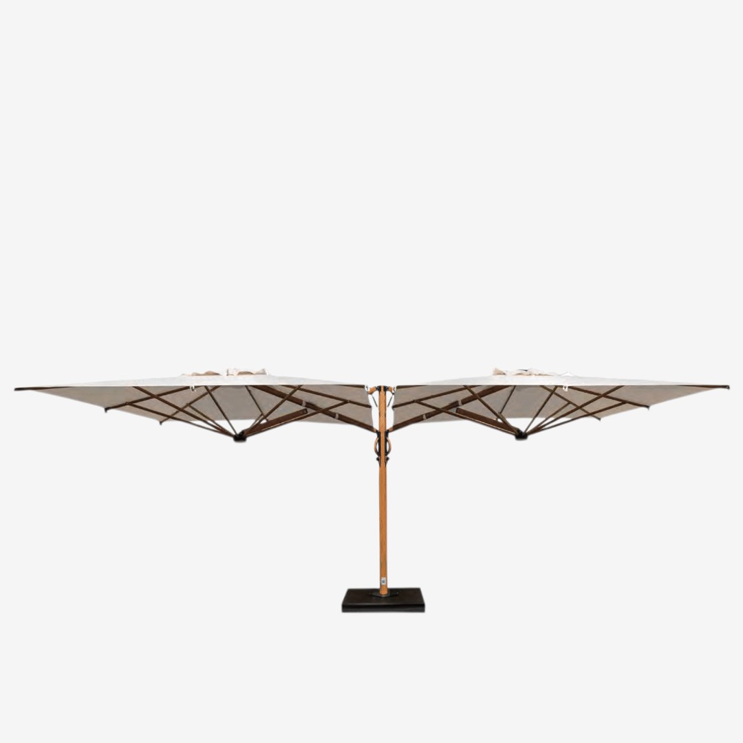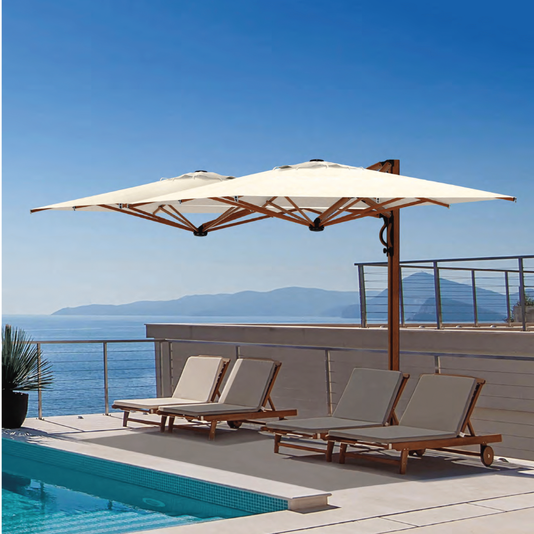 The evolving, innovative design of the DUAL "V" TIMBER Parasol includes extensive extended shading coverage with an attractive natural design along with high-quality and professional durability. The dual opening and closing mechanism features a revolutionary spring-assisted gas mechanism that enables effortless opening and closing above tables and chairs with no requirement to move any furniture.