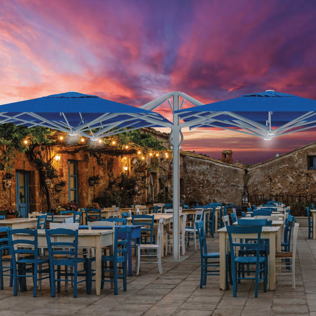 The QUATTRO STARWHITE group has taken the single-ASTRO parasol concept to the next level by providing maximum shading coverage while maintaining a bright, crisp appearance in the professional outdoor marketplace. With its unique gas-spring mechanism for assistance when opening and closing, it creates a smooth operation above tables and chairs without needing to alter the furniture’s location.