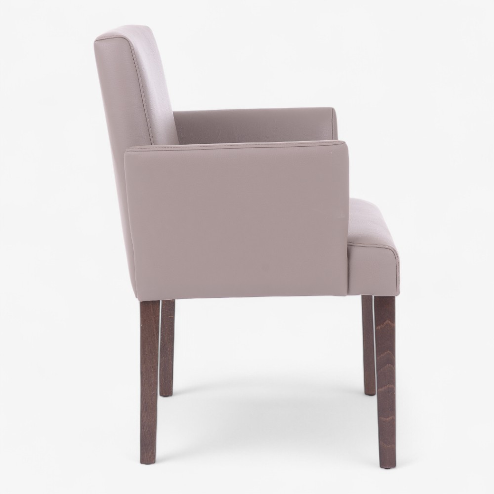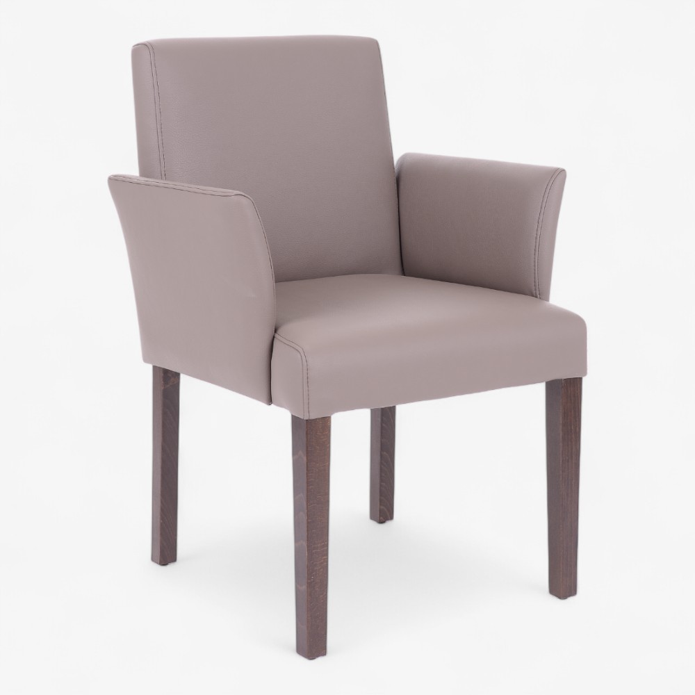 Η πολυθρόνα Vegas διαθέτει κουτι-σχήμα επένδυσης με ενσωματωμένα υποβραχιόνια και σκούρα πόδια από ξύλο. Η μινιμαλιστική σιλουέτα και η πλούσια επένδυση την καθιστούν ιδανική για λόμπι ξενοδοχείων, executive γραφεία ή μοντέρνα σαλόνια.