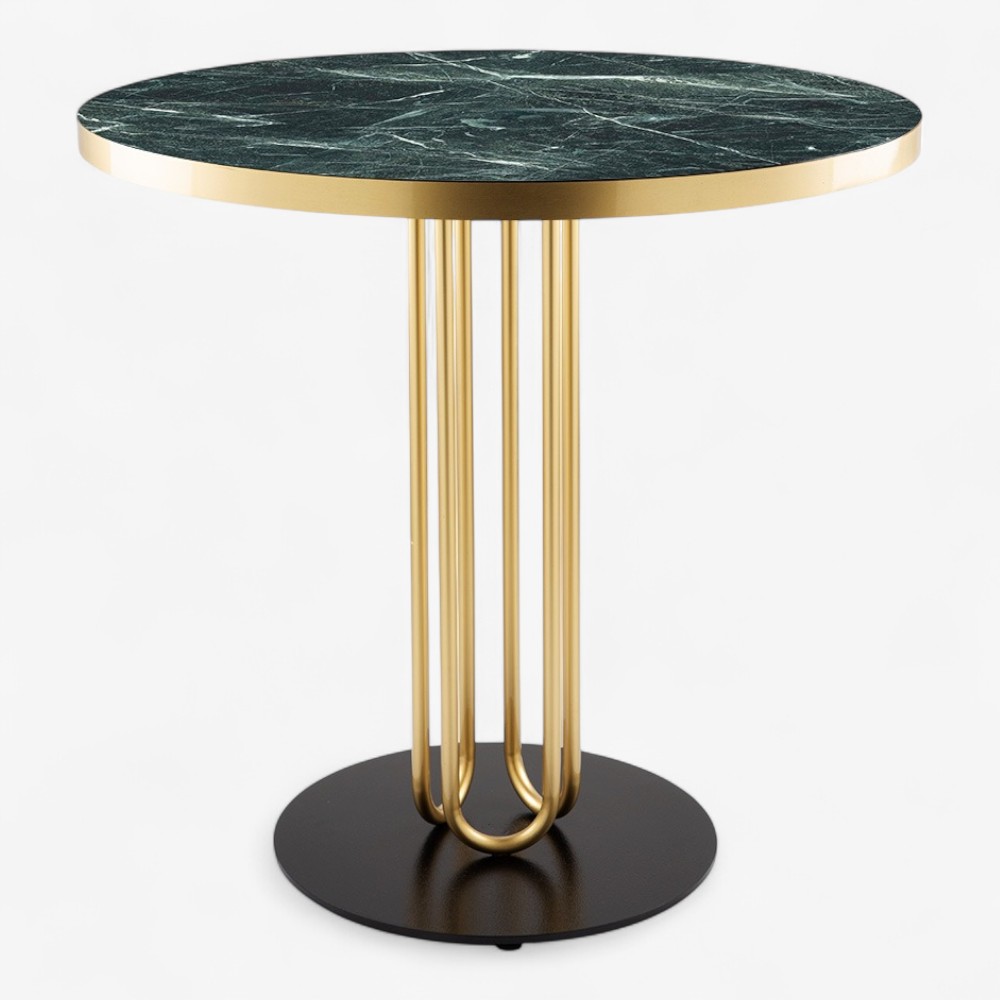 Αυτό το σύγχρονο τραπέζι αποτελεί ιδανική σύνθεση μοντέρνας αισθητικής και λειτουργικής αρτιότητας. Η βάση του αποτελείται από κάθετες, ελαφρώς καμπύλες μεταλλικές ράβδους που ενώνονται ομοιόμορφα στο πάνω και κάτω μέρος, δημιουργώντας μία στιβαρή αλλά ταυτόχρονα ανάλαφρη αρχιτεκτονική μορφή. Οι ράβδοι είναι συμμετρικά τοποθετημένες και στηρίζονται σε κυκλική πλατφόρμα, εξασφαλίζοντας σταθερότητα και ξεχωριστό οπτικό ενδιαφέρον. Ιδανική επιλογή για επαγγελματικούς χώρους όπως lounge ξενοδοχείων, εστιατόρια ή αίθουσες υποδοχής. Ταιριάζει αρμονικά με ποικιλία επιφανειών (ξύλο, μάρμαρο κ.ά.), δίνοντας τη δυνατότητα πλήρους προσαρμογής στις ανάγκες κάθε χώρου.