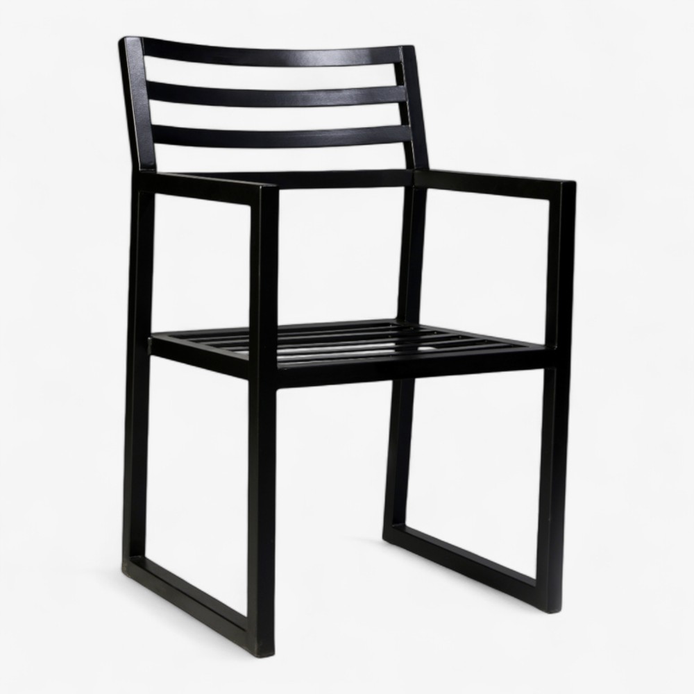 Η πολυθρόνα BOX ξεχωρίζει με την αυστηρή γεωμετρία της και αρχιτεκτονικό χαρακτήρα. Με ανθεκτικό μαύρο μεταλλικό σκελετό, μπράτσα και ίσια πλάτη, ταιριάζει απόλυτα σε σύγχρονες τραπεζαρίες, βεράντες ή γραφεία που αναζητούν δομή και κομψότητα.