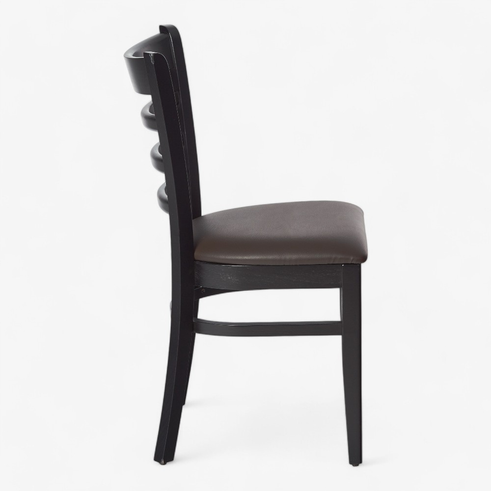 Ξύλινη καρέκλα με οριζόντιες ράβδους και μαξιλαρωτό κάθισμα.