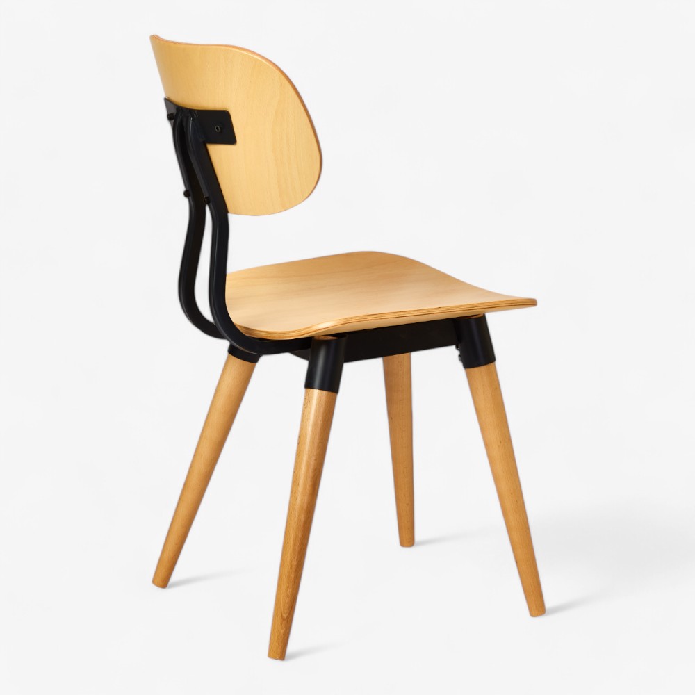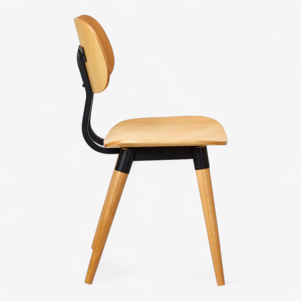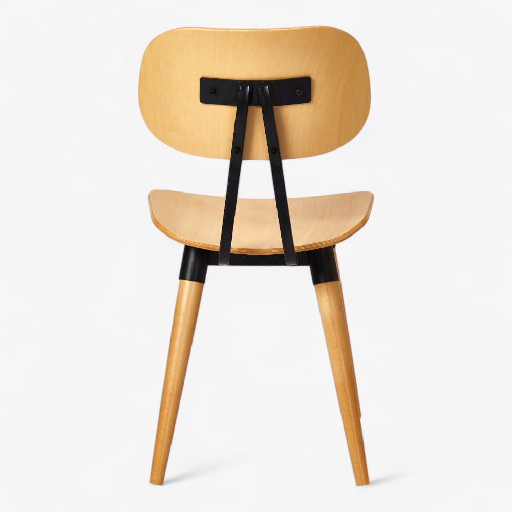 Κομψή ξύλινη καρέκλα με μεταλλικές λεπτομέρειες.