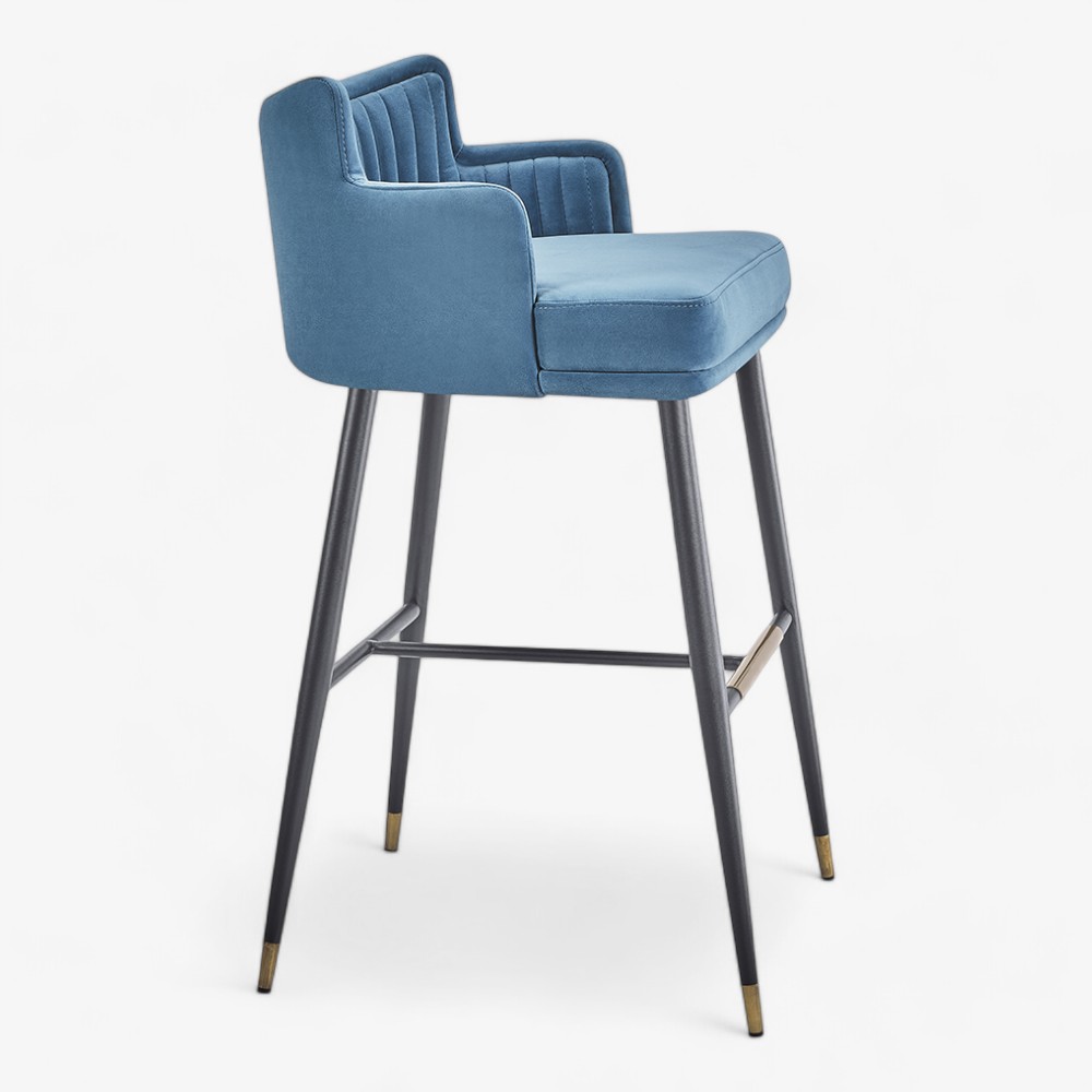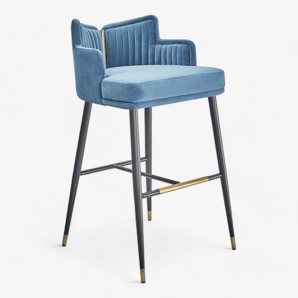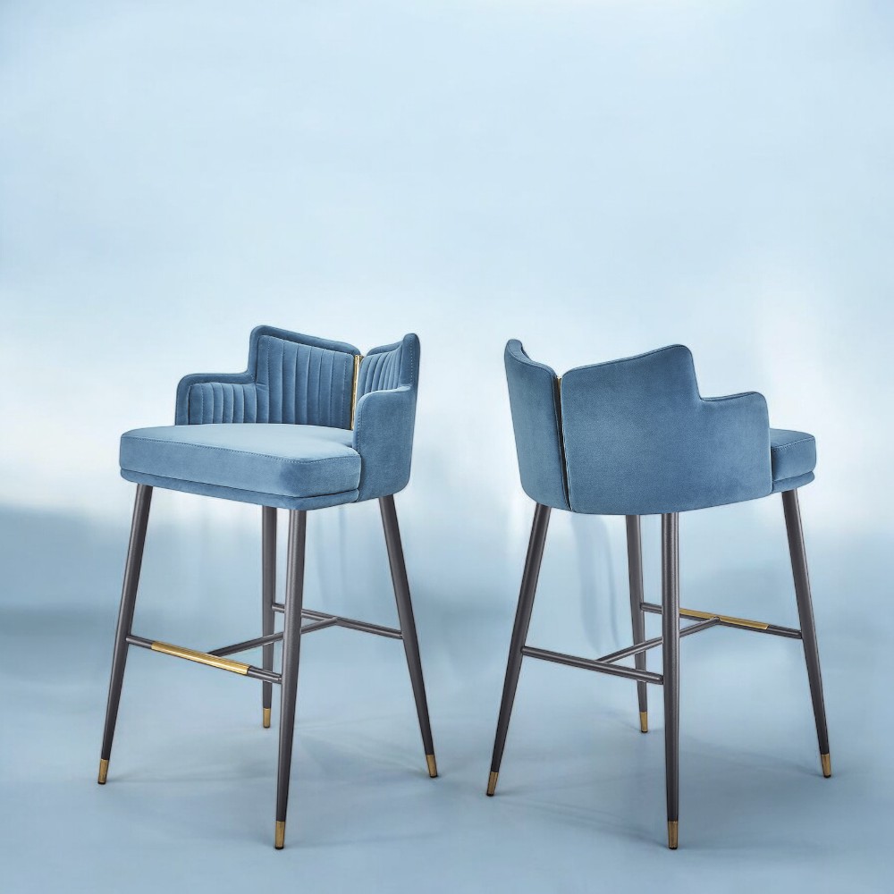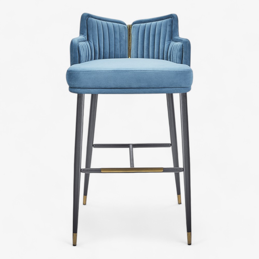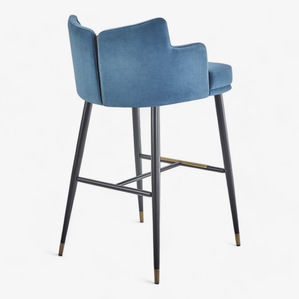 Το σκαμπό Franky B αποπνέει μοντέρνα κομψότητα με την πολυτελή βελούδινη ταπετσαρία και το κομψό του πλαίσιο. Η ψηλή πλάτη και το μαλακό κάθισμα προσφέρουν μέγιστη άνεση, ενώ τα ανθεκτικά μεταλλικά πόδια με χρυσές λεπτομέρειες ενισχύουν την αίσθηση πολυτέλειας. Ιδανικό για να προσθέσετε μια πινελιά κομψότητας στην κουζίνα σας, το μπαρ ή το τραπέζι.