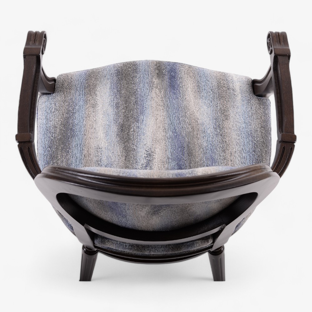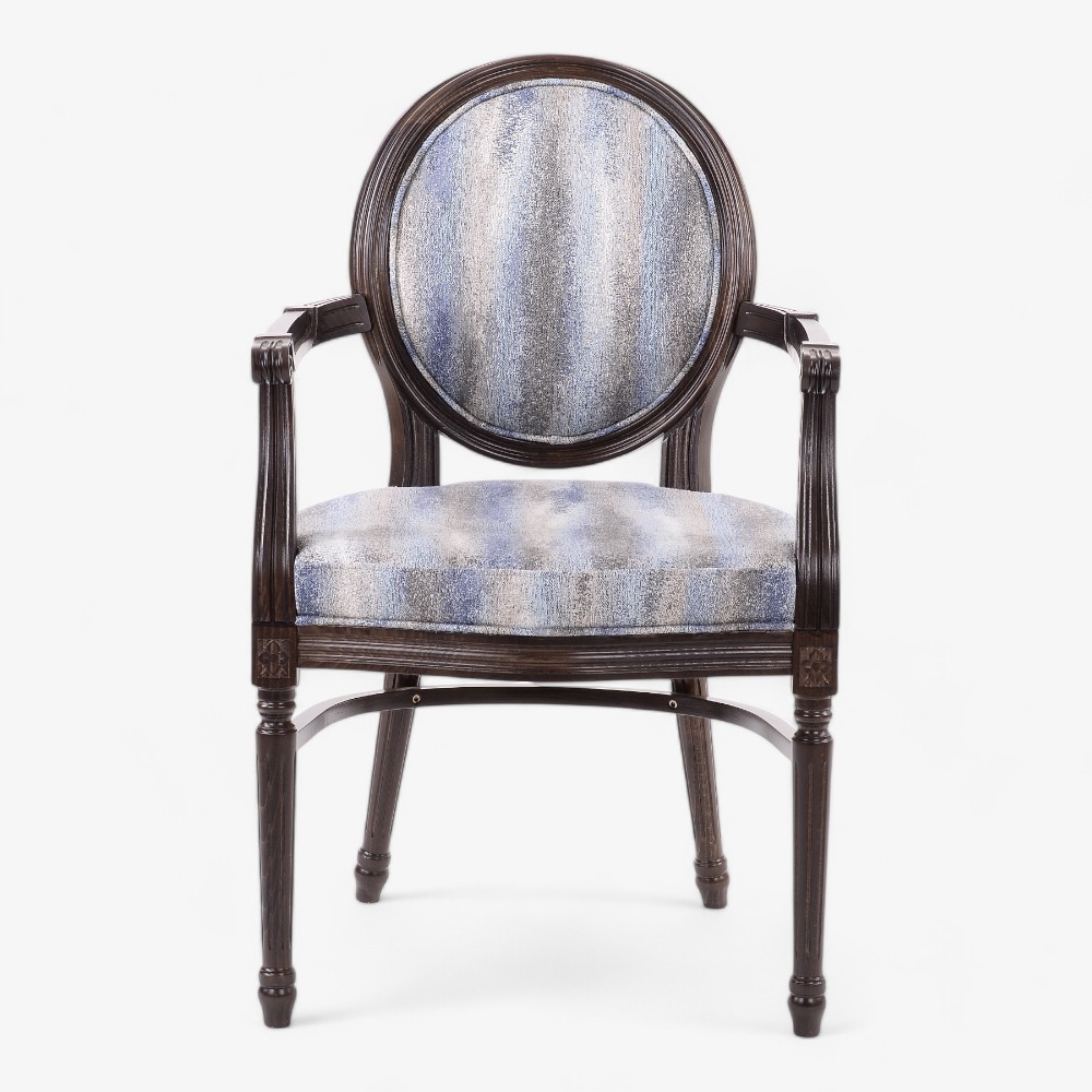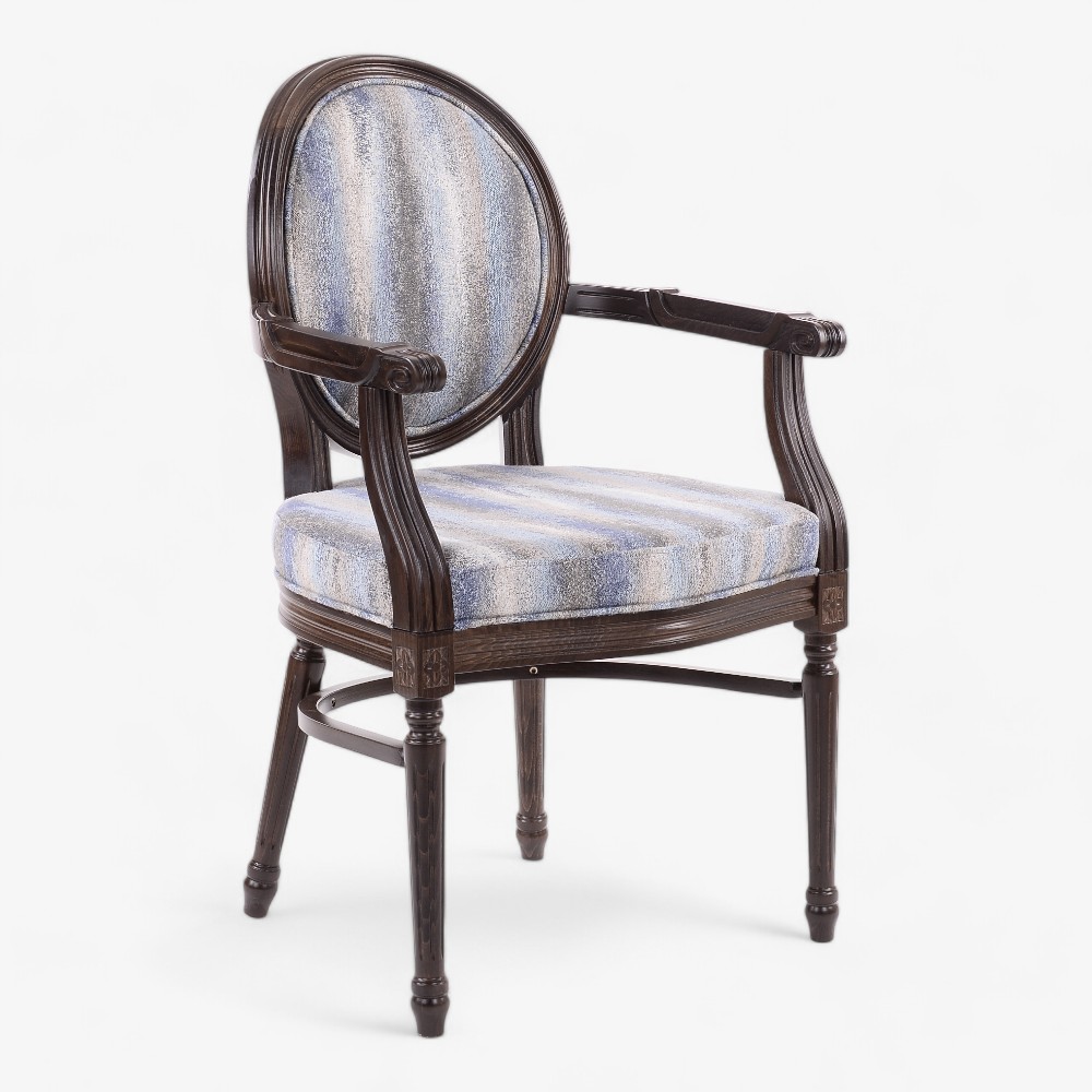 Η Grace AL πολυθρόνα αποπνέει διαχρονική κομψότητα με τον vintage σχεδιασμό της. Διαθέτει στιβαρό ξύλινο σκελετό και περίτεχνα σκαλισμένα μπράτσα, προσφέροντας ανθεκτικότητα και εκλεπτυσμένη αισθητική. Η ταπετσαρία διαθέτει απαλό ύφασμα με μπλε και άσπρες ρίγες, δημιουργώντας μια χαλαρωτική εμφάνιση, κατάλληλη για κάθε εσωτερικό χώρο. Ιδανική για σαλόνια, γραφεία ή ως κεντρικό κομμάτι σε κάθε σπίτι, αυτή η καρέκλα συνδυάζει άνεση και κλασικό στυλ.